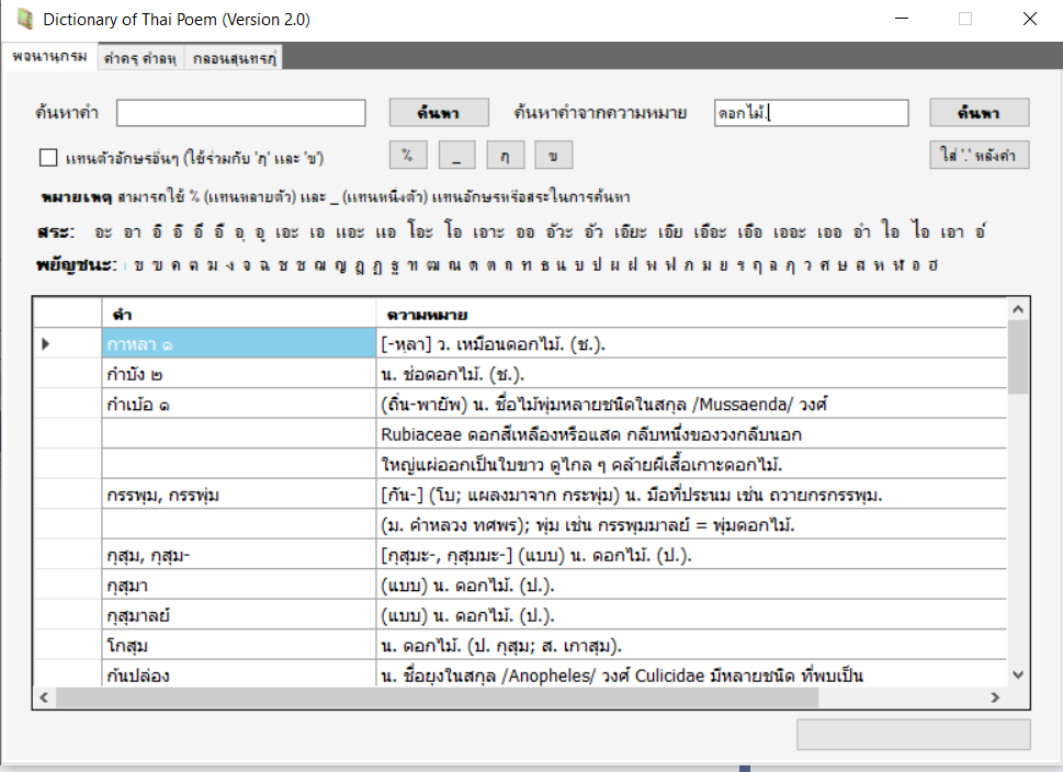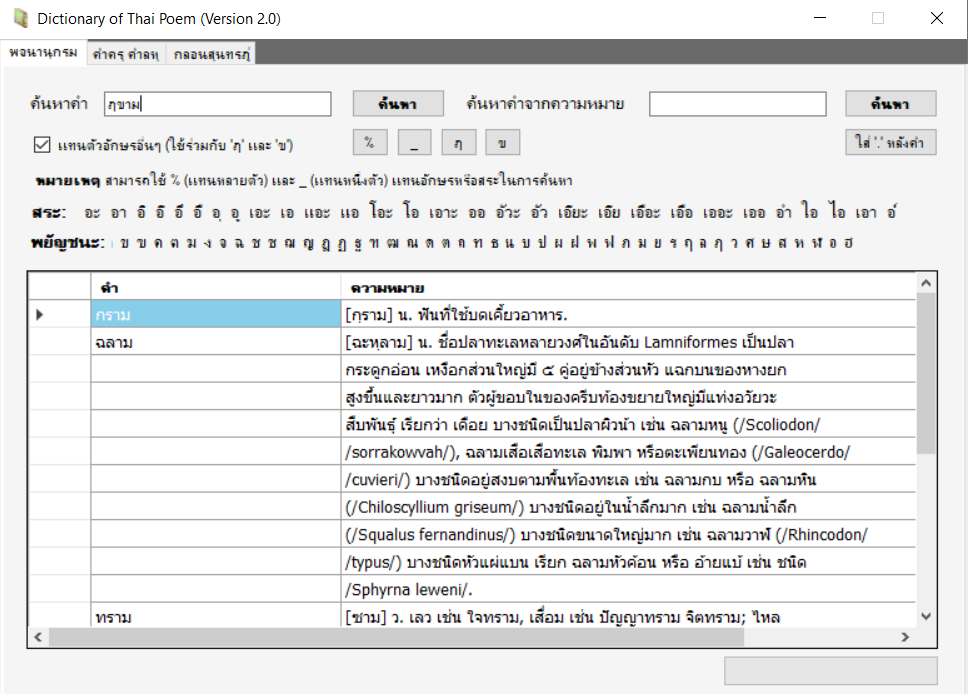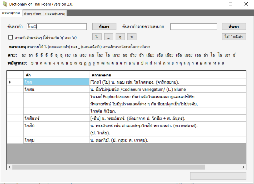 พจนานุกรมช่วยหาคำตามฉันทลักษณ์ เพื่อให้สัมผัสนอกและสัมผัสในมีความไพเราะยิ่งขึ้น ซึ่งสามารถเลือกหาคำตามอักษร สระ ตัวสะกด และความหมายได้ตามต้องการ